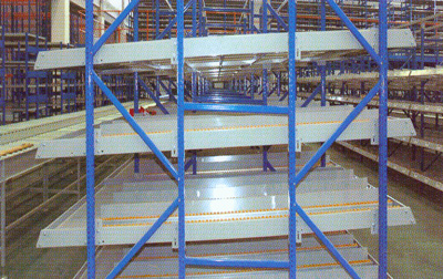 流利条货架与重力托盘式货架的不同之处在于手工存取,在重力的影响下,货物在塑胶滚道上滑至取货区。