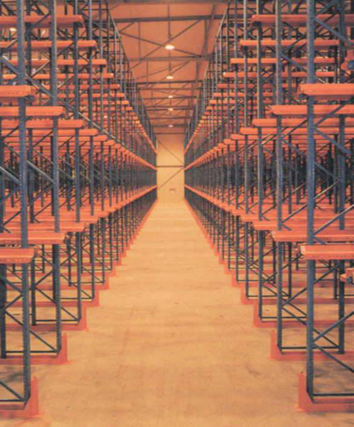 适用于存储量大,品种少的货物,叉车可直接进入货物通道存储货物,仓库利用率高。